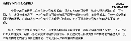 有一部分人觀察網站有沒有降權會觀察網站的快照,如果一個網站的快照突然倒退,那麼意味著這個網站降權,其實這是一個錯誤的認識。今天公司網站的快照突然回檔,但是用站長工具測網站預計流量沒有變化,關鍵詞排名沒有變化。要知道,網站降權首先影響的是關鍵詞排名。百度在站長平台上作出聲明,快照回檔倒退並不表示降權。