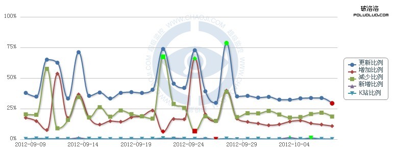 上周回顧:百度沒有出現大規模的更新現象。在百度收錄方面:百度更新總體幅度平均在35%左右,其中收錄增加比例在15%左右,收錄減少比例平均在20%左右,新站收錄比例平均在0.20%,網站被K站比例平均在0.2%,2012年10月6日(周六)在收錄更新總體比例不大33.76%,但K站比例卻出現導常的反常,力度在1.12%,這讓很多站長心中一顫,在搜外群內有很多好友紛紛說SEO博客落馬現象,這不能不引起大家的注意。