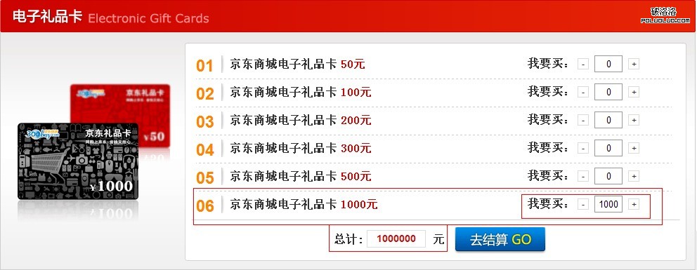 大家看到了,我選擇了買1000元的禮品卡1000張,總計是100W元一分都不少,從這點看,此卡不具有實惠性。