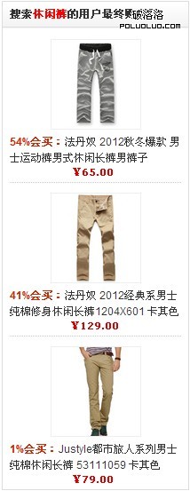 搜索休閒褲的用戶還購買了這些東西,很高明的手法,你搜休閒褲就只買休閒褲哦?也許你還需要點其他東西的,既然來都來了,干脆就多