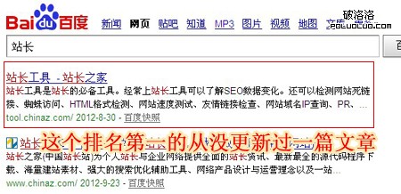 我的網站圖片甚至連SEO經常說的“給圖片加上文字說明提高頁面的原創度”都省了,而結果卻有了同樣的收錄排名效果。這是為什麼?因為那對用戶來說是不必要的。搜索引擎已經不再是那個以文字來決定內容質量的時代了,誰整天那麼有空來看你的偽原創文章啊。現在的搜索引擎很大程度地加入了用戶的行為記錄,比如用戶的停留時間、用戶的退出率、用戶的回訪率等等。只要網站的內容優秀能夠留住用戶。並不在乎網站是否經常更新,更新的文字有多少。當然如果你是以資訊為主的網站,當然是要經常更新的,因為這本身是你留住用戶的手段嘛。最後,大家再看看一個我們都熟悉,卻從沒更新過內容的網站吧。網站內容更新的需求,應該是跟你網站本身的類型、面向的用戶相關的。