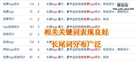 我們先看看網站在搜索引擎的表現確實是良好的,站長工具給出的百度權重是3。眾多相關關鍵詞比如“免費LOGO設計”、“免費LOGO”等等都是在前三位,長尾關鍵詞分布也廣泛,但我並沒有耗費太多的精力去更新內容。