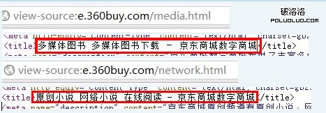 除了在主域名下目錄,還有在二級域名下的目錄中的title的表現方式,直接說明title的寫法吧,比如說在電子書頻道,title就是這個樣子”電子書 電子書下載 免費電子書 京東商城電子書頻道“,而在青春文學版塊,title為”青春文學電子書下載-青春文學相關電子書資源–京東商城電子書頻道“,我相信這些title都是大家所熟悉的設置方式,因為將這些長尾關鍵字堆積在title之中,然後通過長尾關鍵字的優化提高主關鍵字的排名,這是我們最常用的優化方式了;所以說,京東在這裡采用了最常用的title的設置方法,一來說明了這樣一種模式的可用性,那就是通過長尾關鍵字入手,另一點也說明了網站越大,那麼你涉及到的形式盡可能的按照最基礎的方式來進行,不用過於復雜,有時候簡單即是幸福。