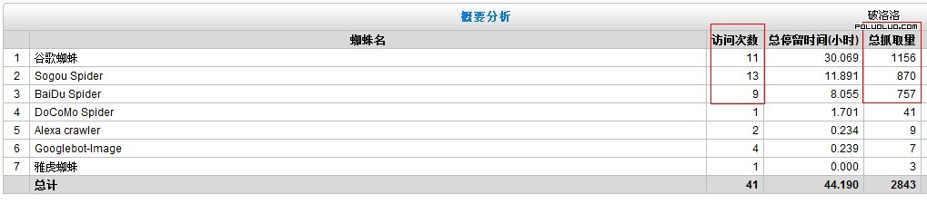 從朋友處要來了前一天的網站LOG日志,下圖是日志分析工具得出來的蜘蛛概要截圖。從圖上我們可以看到三大主流搜索引擎的蜘蛛訪問次數、停留時間和總抓取量等信息。