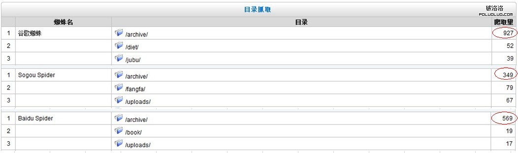 第二步,來看看網站目錄的抓取情況。下圖是截取了三大主流蜘蛛目錄抓取Top3目錄的一個截圖,從圖上我們可以看到圖上的archiver目錄的抓取量遠遠超過於其他的網站目錄。這個數據讓我有點不安心了。