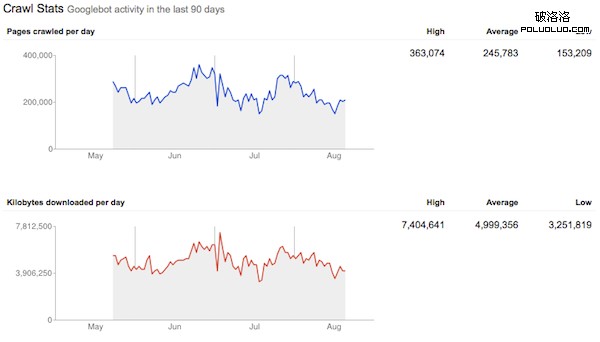 如下圖,你可以從Google的網站管理員工具中知道,Googlebot的抓取頻率與抓取量:
