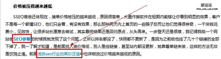 上圖中箭頭所指的淺談seo行業白菜價泛濫這就是正文中出現的關聯文章內鏈。
