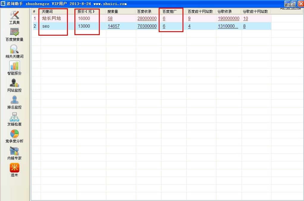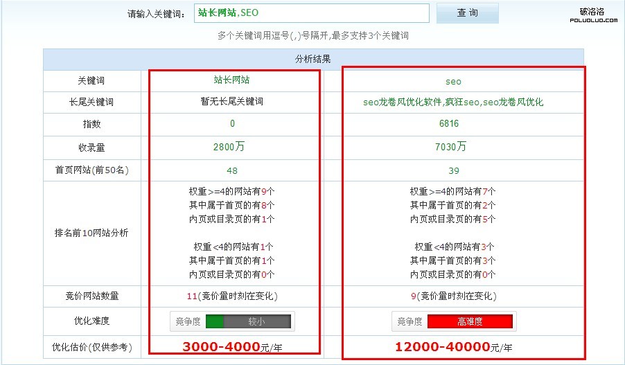 現在市面上有很多SEO輔助工具是帶關鍵詞報價功能的。它們的原理無非就是判斷某個關鍵詞的搜索量,收錄量,競價網站多少等等。在根據程序事先設置好的價格,進行比對。軟件自動估價可以為SEO工作者減少很多麻煩比較快速的就能得出關鍵詞的各項數據和報價,但是軟件估價算出來的報價大部分都偏高很多,偶爾也會偏低很多。筆者建議軟件估價可以作為一個參考值來看待,不能完全的把軟件估算出來的價格直接報給客戶。看下圖,從圖裡可以看出“SEO”和“站長網站”這兩個詞的報價很是很高的,“站長網站”這個詞報價甚至超過競爭度遠遠大於它的“SEO”。