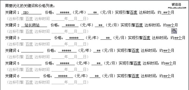以上就是筆者關於SEO關鍵詞報價的一點點心得。順帶的說下,客戶有的不會同意按年付費,有的為了保險起見,會要求按月付費,我們在報按月付費的時候,一定要比按年付費的單價高一些,畢竟按月付費我們也承擔一些風險。按月付費一點要在報價單上詳細寫出月付價格,比如下圖:
