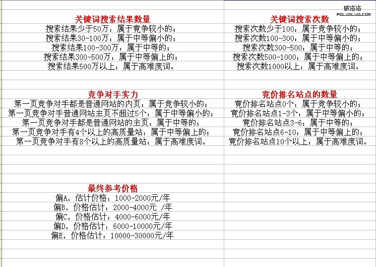 上面和大家介紹的都是屬於傻瓜式報價,雖然可以省去很多麻煩,但是估算出的價格還是懸殊很多的。而且,現在客戶都會索要報價單,如果使用軟件網站報價,得出來的只是一個價格。客戶索要的報價單,裡面要分析出關鍵詞一切信息,和價格依據。所以真正接客戶的時候還是自己算出價格和起草報價單,這樣會顯得自己很專業。大家也一定會認為自己估算價格肯定會很麻煩。其實掌握技巧一點也不難的。首先我們起草一份報價單。報價單裡面列出關鍵詞的考核標准。筆者大致的和大家列舉一些:搜索結果,搜索次數,競爭對手實力,竟價排名站點的數量。然後把需要做的關鍵詞這些信息結果在列舉出來。這樣自己看著方便,同樣客戶也能直白的看到結果。最後我們根據自己檢索出來的關鍵詞信息來估算價格。我一直用的標准如下(大家可以作為參考,我相信SEO公司都有自己的標准)。