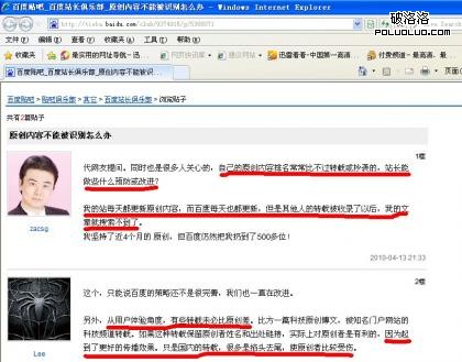 2010年4月13日,在百度貼吧站長俱樂部中,知名SEO專家ZAC在“代人提問原創內容不能被識別”帖子中發問道:“自己的原創內容排名常常比不過轉載或抄襲的,站長能做些什麼預防或改進?我的站每天都更新原創內容,而百度每天也都更新,但是其他人的轉載被收錄了以後,我的文章就搜索不到了。我堅持了近4個月的原創,但百度仍然把我扔到了500多位!”