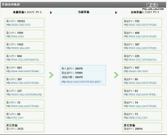 頁面訪問軌跡即用來完成該功能,用戶可自由指定觀察焦點頁面,系統會列出該頁面的前十位來路頁面和去向頁面。對觀察焦點頁面而言,其自身的導入、導出PV 的多少能夠反映出該頁面在網站的權重地位,而通過觀察來源和去向頁面又能最大限度的了解到訪客的行為習慣及興趣點。
