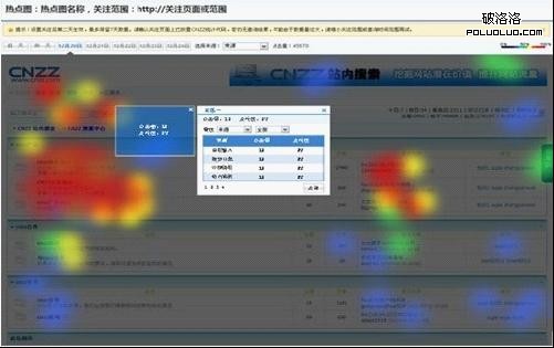 CNZZ統計工具在設計及研發上更加注重用戶體驗與實用性,用戶只需將關注的受訪頁面鏈接添加到“熱點圖”功能中,並保證該頁面已成功放置CNZZ“站 長統計”代碼,第二天即可查看“熱點圖”相關數據情況。在申請開通“熱點圖”功能後,用戶可同時關注十個熱點頁面。打開某一頁面熱點圖,興趣點展現一目了 然,圖中紅色區域表示點擊熱度最高,橙色、黃色、綠色次之,而藍色區域則表示點擊熱度最低。