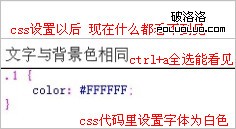 在別人網站或者論壇做外鏈的時候,可能會把文本顏色設置同背景色相同這樣發外鏈就不會被管理員發現,但是只要全選之後就可以看見隱藏的文字,在自己網站做內鏈的時候利用css把字體顏色設置和背景相同,雖然用戶看不見,但是搜索引擎會發現的。