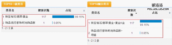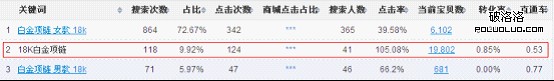 由圖上可以看出寶貝類目是黃金/黃金,搜索18k白金項鏈總搜索量是117,寶貝類目是項鏈時,搜索18k白金項鏈總搜索量是1。