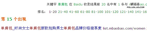 在原文中,提到的還有一句,“同理大家還可以選擇一個熱門分類查看,如“單肩包”也是動態的網址:網址。..。.”看到這裡的時候,既然上文中已經提到了robots.txt屏蔽帶?的所有頁面,那麼這裡的單肩包相信也是被屏蔽的,筆者好奇搜索了下單肩包的排名,如圖