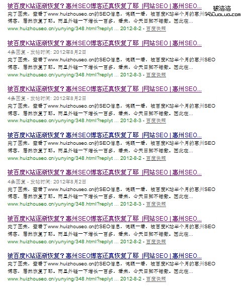 從圖上我們可以看到博文《被百度K站逐漸恢復?惠州SEO博客還真恢復了耶》被重復收錄達10篇之多,而這重復收錄的,便是該篇博文的評論。其實在被k以前,沒來及關注便被K了,這可是一大失誤。