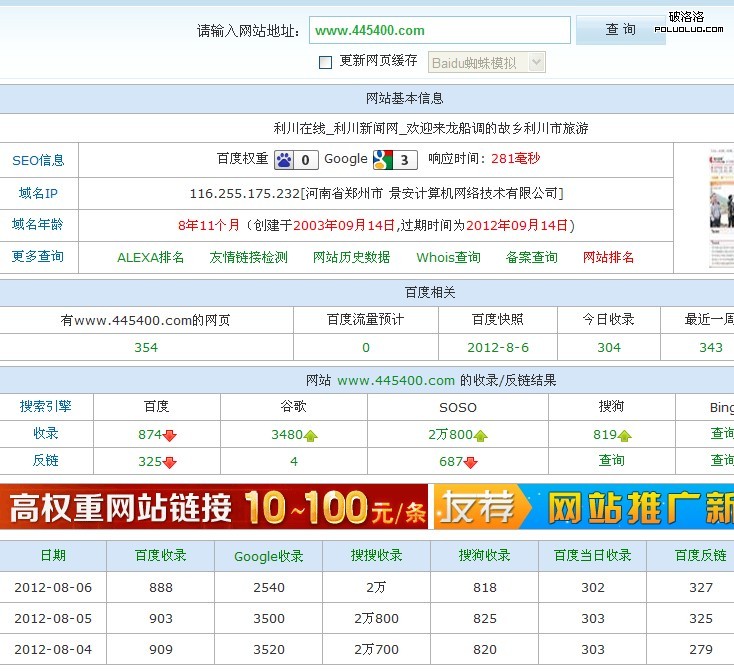 由於這幾天工作比較忙,文章寫到一半就停了,上面的文字是7月30號就寫了,一個星期以後才想起這個事情,再上一張今天的SEO綜合查詢圖片,今天是8月7日。