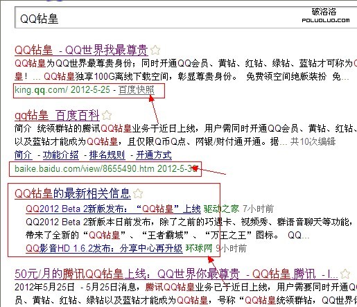 先解釋一下這個關鍵詞,QQ鑽皇是QQ推出的一項新的業務。我們都知道目前騰訊在國內擁有的用戶群有多廣,推出一項業務自然而然會引起大的關注。在上圖中我們可以看到在推出後搜索量一度達到了63000。自然而然筆者的站點不能放過這一個關鍵詞。可是筆者搜索一下這一個詞,看到可搜索結果卻讓筆者望而卻步。