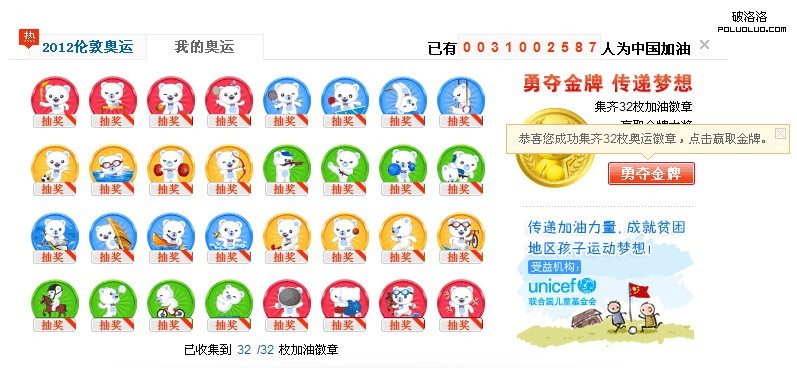 因此,對加油徽章的搜集,不但能為中國加油,能掙個抽獎的資格,更重要的是以舉手之勞為貧困山區兒童做一點小小的愛心奉獻,實在是難以讓人拒絕,同樣的,在寫這篇文章之前也已集齊了所以的徽章。就從這一點看來,百度抓住了用戶的心裡,用最小的代價,從而保證了很好的用戶體驗,很好的口碑,以及瘋狂的PV,僅僅從這一點上看,做得很是了得。