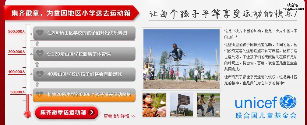 而在最後百度還出動愛心傳遞,與聯合國兒童基金會合作。只需用戶集齊所有的加油徽章,百度便給貧困地區小學送上與運行相關的儀器禮品,讓更多的小孩子享受運動之快樂。然而,就從這一點上看,百度的運營策劃方案做得很高明。畢竟對於一個用戶而言,僅僅是為了中國奧運健兒加油,也就可以為其集齊所有的加油徽章了,抽獎相信更多的是抱著無所謂的心態,可這愛心的傳遞確實很致命的原因。