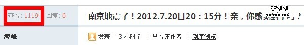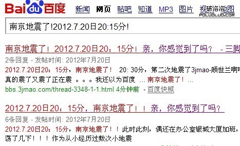 這次的收獲就是,在寫標題的時候,一定要把重要的關鍵詞寫在前面。我的標題是:“南京地震了!2012.7.20日20:15分!親,你感覺到了嗎?”,在百度搜索“2012.7.20南京地震”和“南京地震2012.7.20”都排在我仿造的帖子的前面,他的標題是:“2012.7.20日20:15分,南京地震了!!親,你感覺到了嗎?”