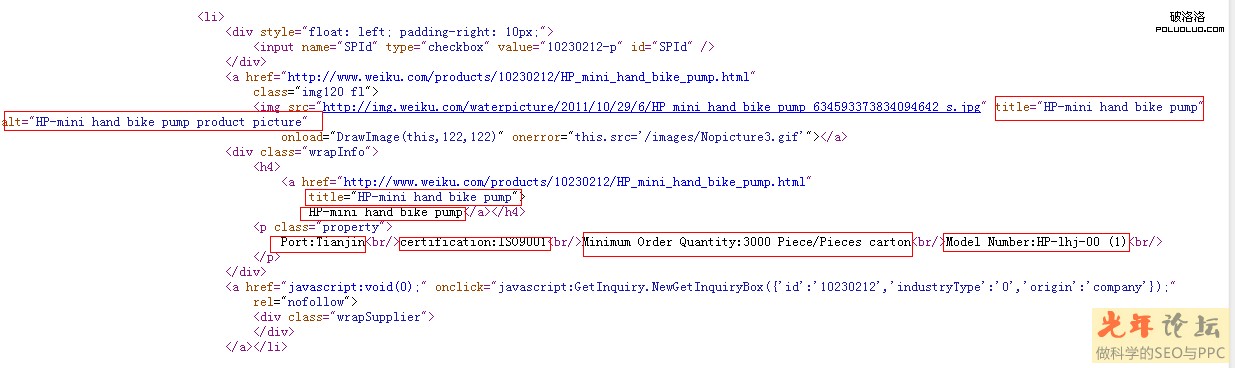 <img src="http://upload.chinaz.com//” title=“HP-mini hand bike pump" alt="HP-mini hand bike pump product picture" onload="DrawImage(this,122,122)" onerror="this.src='/images/Nopicture3.gif'"></a> 標簽,這是個圖片展示標簽,該標簽也是網站對圖片優化的重要部份,因為搜索引擎目前識別圖片的技術還不強,所以它不能知道圖片裡是什麼內容。而只能通過圖片周圍的文字,img 標題的alt 屬性來獲取文字判斷。所以對圖片的優化主要是在 alt屬性了圖片周圍的文字描術上。當然為了考慮圖片有時候下載不了時得用一張默認圖片代替,提升網站的用戶體驗。