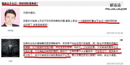 而在回答ZAC提問“百度針對連(鏈)接上存在不存在有效期”問題時,百度Lee回答道:“鏈接時效性問題,實際是有利有弊。利在於,過去的投票,只反映被投票者在過去的價值,不見得能反映現時情況;弊在於,正常投票不大會重復投,過去投過了,現在就可能不投了,但不代表現在對被投票者的不認可”。