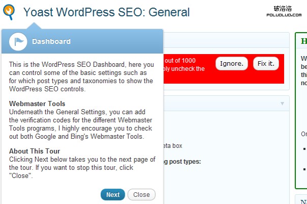 另外Yoast 提供了新用戶指導。一旦安裝後,在wordpress後台屏幕上就會出現設置指導,做的很人性化。這個指導教程說明了新用戶改如何配置以及相應的特色功能。