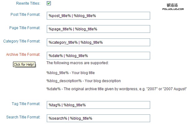 不像 Yoast WordPress SEO,All in one SEO Pack的配置界面非常簡單,每個設置都有相應的說明文字,有首頁標題、描述和關鍵詞設置,也有Canonical URLs選擇,以及頁面、分類、標簽等格式選擇。