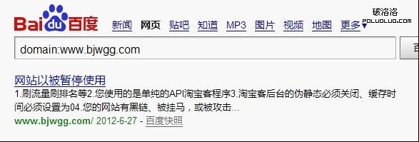 大家可以從圖中看到,用domain語法查詢,網站快照顯示6.27日,網站標題為:網站已被暫停使用,點擊百度快照顯示