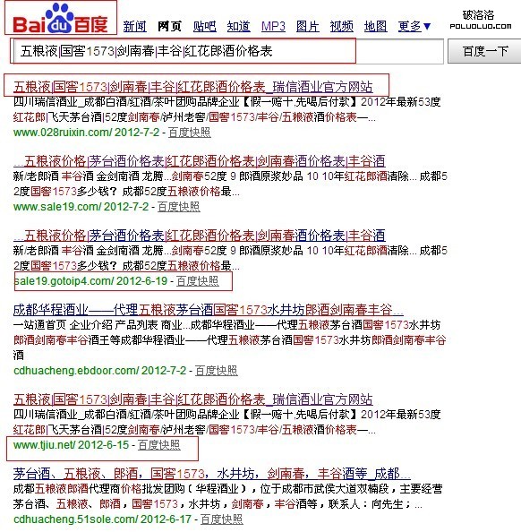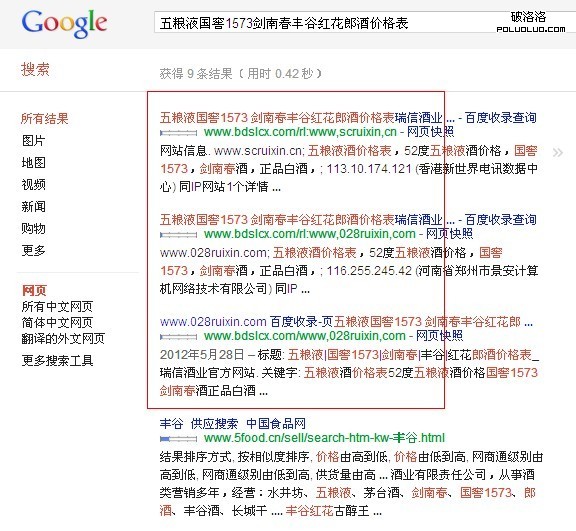 疑惑:為什麼只是看到了國窖1573呢?難道排在第一位的五糧液就不是用戶想在google搜索的一部分?google還自作主張了呢?確實感覺這種搜索很wired。不過當去掉搜索中的豎槓,google表現得更二。搜索出來的前三個都是同一個垃圾網站,做SEO的人很討厭的一種站點,專門抓別人的快照,收錄人家的SEO、快照信息的網站。對用戶一點兒價值沒有的網站,排在了前三位。