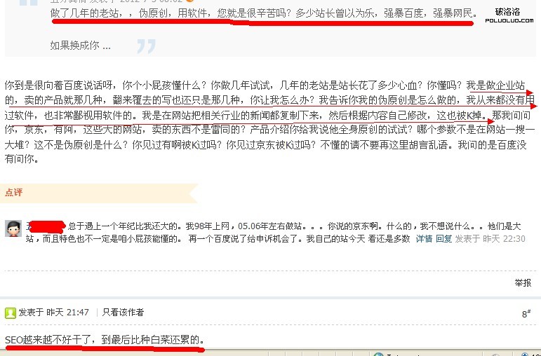 正如許多人所指出的,該公告坦承“仍然難免有誤傷的情況出現”,說明誤傷率仍不低。因此該公告一出,遭到了一些被K網站站長們不斷質疑,一位被K站的老站長在百度站長社區哀歎道:“我是做企業站的,賣的產品就那幾種,翻來覆去的寫也還只是那幾種,你讓我怎麼辦?我告訴你我的偽原創是怎麼做的,我從來都沒有用過軟件,也非常鄙視用軟件的。我是在網站把相關行業的新聞都復制下來,然後根據內容自己修改,這也被K掉”。