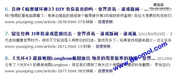 經過:這是一家正規公司運營的游戲網站,3-5個編輯。6月15日,百度收錄由4000降為1700,21日恢復到3500,22日關鍵詞全面下滑,之後www首頁快照消失了3天(23-25)。25日開始整頓所有友鏈,此時友鏈中才有很多網站出現首頁快照消失的現象。26日恢復首頁,但幾乎無任何關鍵詞排名。27日-29日,整個網站收錄加速(5分鐘-1小時),快照數量達到6000,有微量關鍵詞排名。