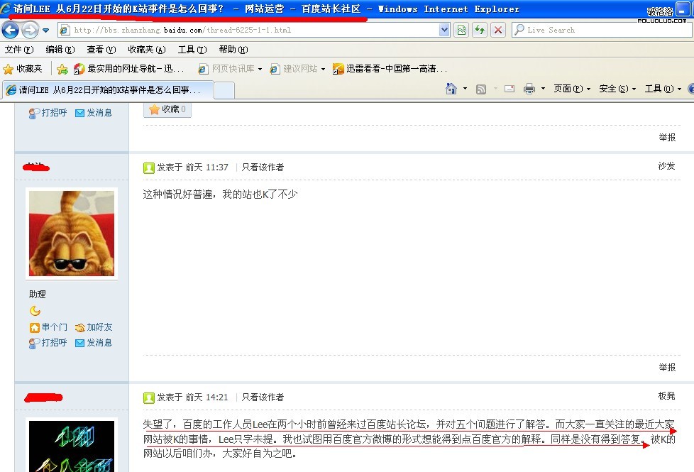 值得注意的是,雖然與去年相比,百度此次“大地震”有過之而不及,但與去年6月下旬百度大地震一樣,百度至今依然保持沉默——甚至在百度5月底才上線的站長社區內雖然叫苦聲一片,百度搜索工程師Lee這幾天也照常在社區裡回答了一些網站SEO的基本問題。可令人感到不解的是,偏偏對於目前眾多中小網站站長、SEOER們十分關注的百度排名激烈振蕩及K站問題,百度官方卻沒有任何只言片語的表態,甚至百度搜索工程師Lee對於站長們指名道姓的提問卻始終沒有回答,同時百度官方微博對此也只字未提,這不能不令人浮想連翩。