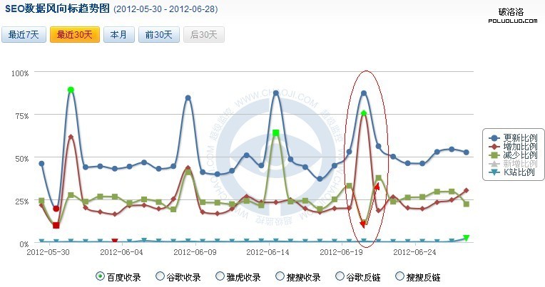 討論因素9、外鏈變化。就上圖來說,都是一些2個月內容的站點,外鏈基本還是屬於上升狀態(也不是外鏈增加太快,雖然我們這些站2個月不到就幾千外鏈),並非外鏈 變化導致站點的被K情況發生。