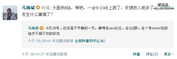 到了8點多,我就在幾個長混的QQ群和微薄http://t.qq.com/yumaoge上發了大體以下意思【6月28號,注定是不平靜的一天。靜等各seo論壇,各QQ群,各個有seoer在的地方不鬧不歡的好戲】。