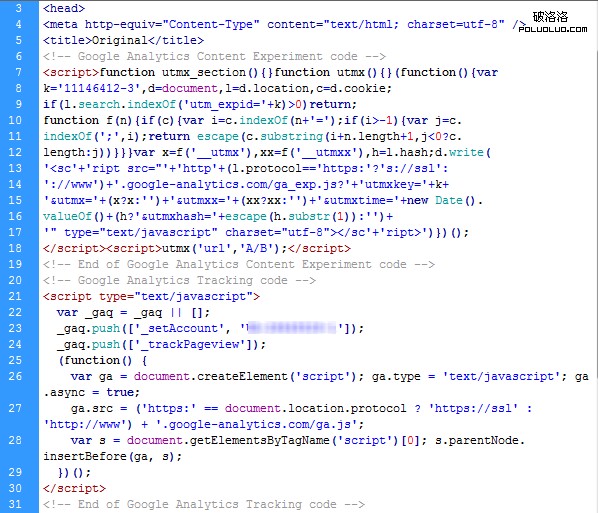 這一步你需要把一些代碼添加至你的原始測試頁面上。在測試的原始頁面<head>標簽中加上生成的代碼即可,而變體頁面不用添加生成的測試代碼,只需配置一般的GATC跟蹤代碼即可。