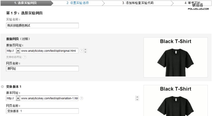 這一步主要是設置變體版本的頁面。實驗的名稱可隨便設置,為便於識別,我把此次實驗的名稱設置為“購買按鈕顏色測試”。然後,在下邊輸入相關變體版本的頁面 地址及名稱即可,輸入頁面地址後,在鏈接後邊的區域將會加載顯示相應的頁面截圖。這一步最多可以添加6個變體,估計已可以滿足絕大部分用戶的需求。