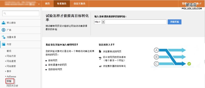 在GA左側導航內容模塊下邊找到【實驗】的菜單,點擊它可進入第一步的設置界面。在第一步中簡單地輸入你作A/B測試的原始頁面URL。輸入原始URL。