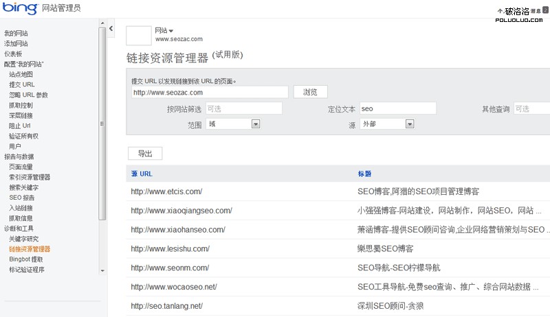 當然也有不足,比如顯示了外鏈頁面的Title,卻不顯示錨文字,沒有按錨文字過濾時就不知道這些鏈接的錨文字了。列出的URL貌似只有200個,這個可以通過不同過濾條件在一定程度上解決。導出的URL不止200個,但應該也不是Bing收錄的所有鏈接,肯定只給一部分。既然是Beta版,估計還會繼續改進的。