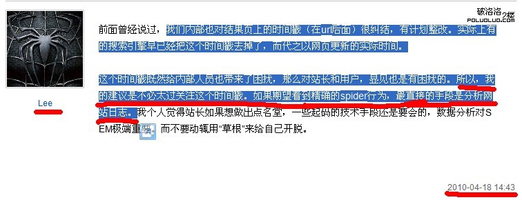 頗具諷刺意味的是,談及百度快照這個“時間戳”,百度搜索工程師Lee卻表示這個時間戳不僅不重要,並且給百度內部人士也帶來了較大困擾,百度有計劃整改。他對站長們說:“我的建議是不必太過關注這個時間戳(不具有特別的SEO意義,引者注)。如果期望看到精確的spider行為,最直接的手段是分析網站日志”。