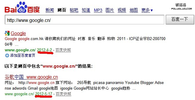 谷歌中國存在兩個百度快照,慢的距離現在差了近兩個月