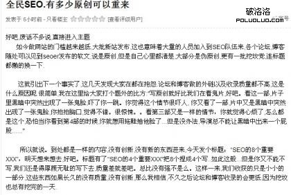 一位SEOER在帖子中不無憂慮地寫道:“到處都是一樣的內容,沒有創新,沒有新的東西進來,今天發個標題:‘SEO的8個重要XXX’,明天……‘SEO的4個重要XXX’把8個捏成4個寫……但是你又不能不寫,我們還是得厚顏無恥的寫下去”。