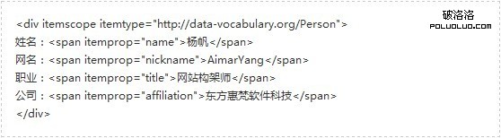以上例子中,第一行中的 itemscope 表示大類,div 中所含的內容描述了某一項(有人物、商品、地址、活動、事件等等),而 http://data-***.org/Person 則定義該項是人物(第二個案例中我們定義了商品)。