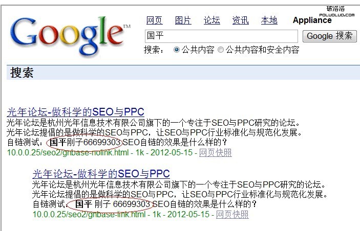 PS:測試的時候疏忽掉了,link這個頁面是14號已經抓取並收錄過的,nolink是15號新加上去的,開始測試link顯示的日期為2012-05-14,後來發現後改了一下頁面,GSA自動重新抓取了一次,link頁面的日期才同步到15號。在搜索三個測試詞的時候,link雖然抓取早,但是排名卻沒有後抓取的純文本頁面高。不過在搜索頁面標題的時候,還是先抓取的link頁面排名高。