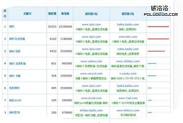 但大部分站處於一個積累的時期,權重不夠,拼不過國內大亨,則需要選擇長期穩定的詞去推廣。比如以“最新電影”擴展的長尾詞,且大部分站長也是這樣操作的。長尾詞不斷地積累後,網站有了流量才是關鍵。慢慢積累,等待後期爆發。在選詞的時候必須要關注這些詞的競爭度,做視頻站的太多的,根據用戶習慣確定與電影,電視劇相關的不同詞才是王道。挖掘競爭小的詞才有推廣到高處的可能性。