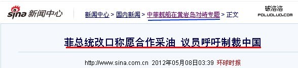 2、“菲議員呼吁制裁中國”的鏈接是指向的對應的文章內容頁,標題是“菲總統改口稱願合作采油 議員呼吁制裁中國”,從文章內容頁的面包屑也可以看出和上面的專題頁面屬於從屬關系。文章在首頁的標題比完整標題短了。