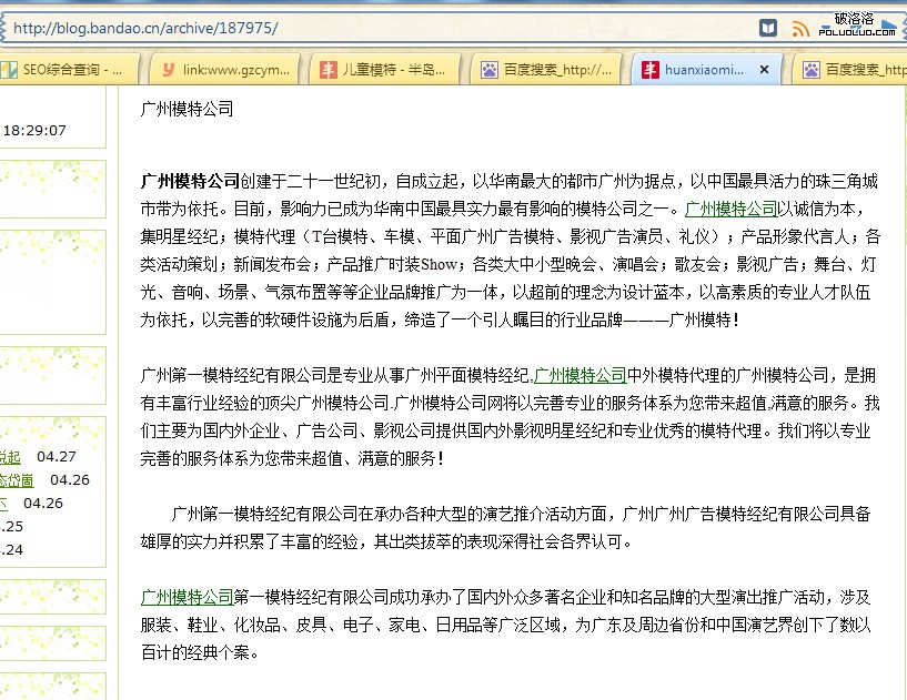 反鏈總數1930的這個站點使用的外鏈建設方法有:首頁友情鏈接交換,網站分類信息群發,百度知道鏈接,百度貼吧鏈接,查詢網站批量提交,論壇簽名外鏈,行業信息平台提交,論壇廣告貼鏈接,博客外鏈等,這其中分類信息群發和行業信息平台提交,占80%的比重。其中包含“廣州模特公司”關鍵詞的反鏈中,有一半為自身網站的url,剩下的站外關鍵詞反鏈,大概100-150左右,排在第六位按照數據簡單分析還是差不多的。