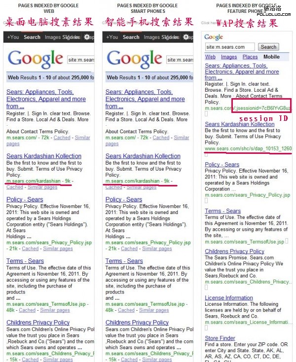 上圖中我們可以發現非智能手機的wap搜索結果中的URL地址都帶有session ID,甚至是主頁的URL地址都有。同時我們也可看到在出了第一位的搜索結果是一樣,其他的搜索結果的頁面URL地址是不同的。在智能手機和桌面電腦的搜索結果中,第二個頁面目錄是:“Kardashian Kollection ”,而WAP的搜索結果頁面的第二個頁面目錄是“shc/s/dap-… ”。從標題我們可以看出都是命名為“Sears Kardashian Kollection ”,但是實際上URL地址卻是不同的。我們可以看出其搜索結果排名存在著一定的差異。